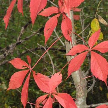 This climbing vine in the grape family produces berries that are an important food source for wildlife. It has beautiful red foliage in the fall. Because its tendrils leave behind tiny dots that stick to its climbing surface, it may not be appropriate for climbing on painted surfaces.